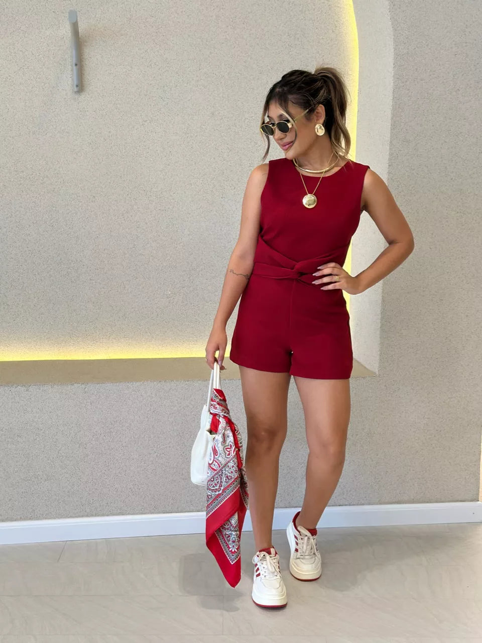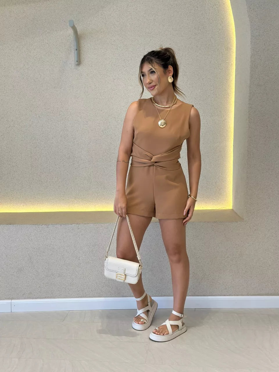 O Macaquinho Eloisa Amarração é a combinação perfeita de elegância e conforto. Com modelagem cavada e gola redonda, ele traz um visual moderno e sofisticado, com caimento impecável que valoriza a silhueta. O charme especial da peça está na sobreposição das costas, que se conecta à amarração transpassada na parte da frente – um detalhe que faz toda a diferença.